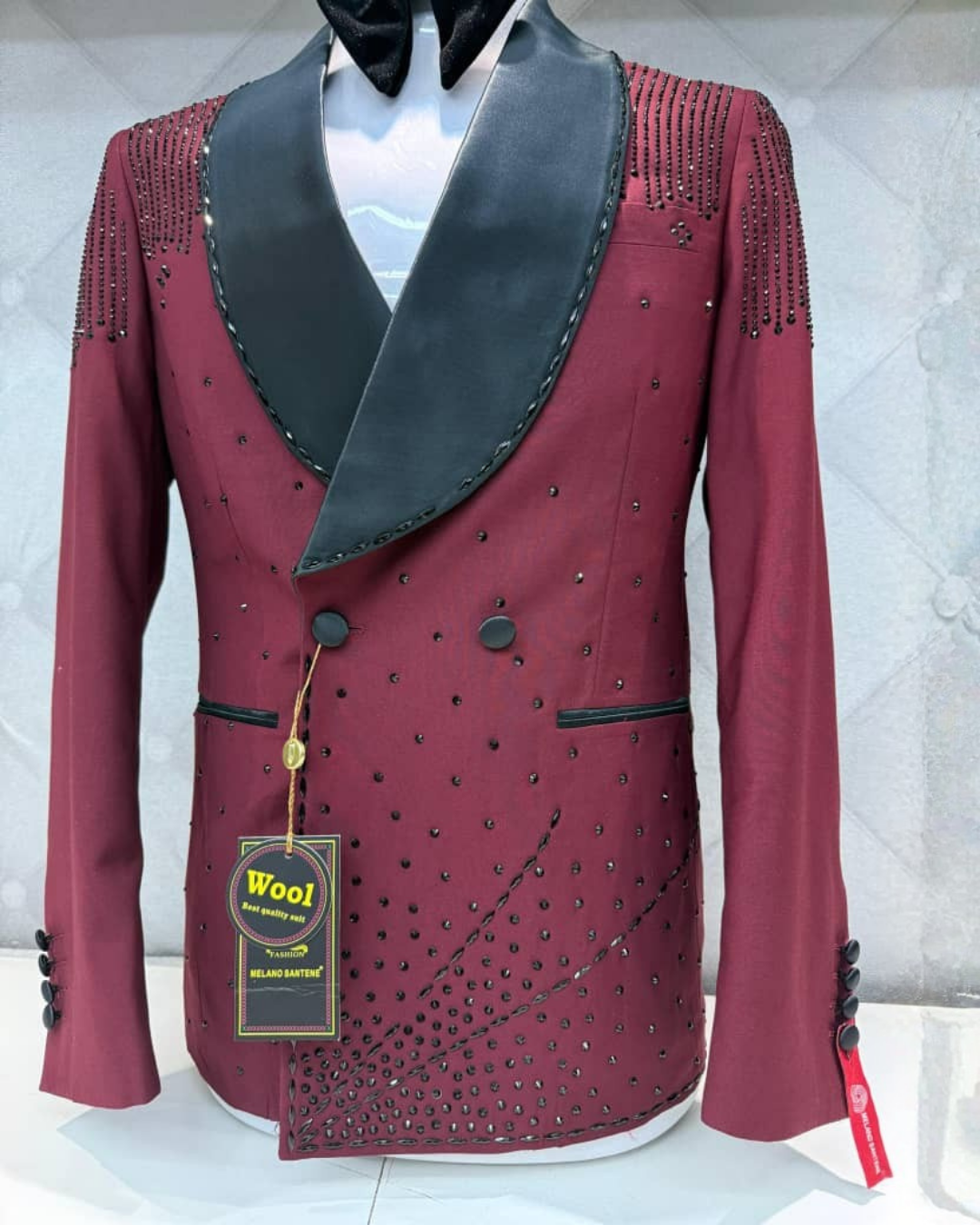 Make an entrance. This burgundy double-breasted dinner jacket features black satin shawl lapels, bead detailing on the shoulders and front, and a tailored fit. Designed for red-carpet events, galas, and luxury evening functions.