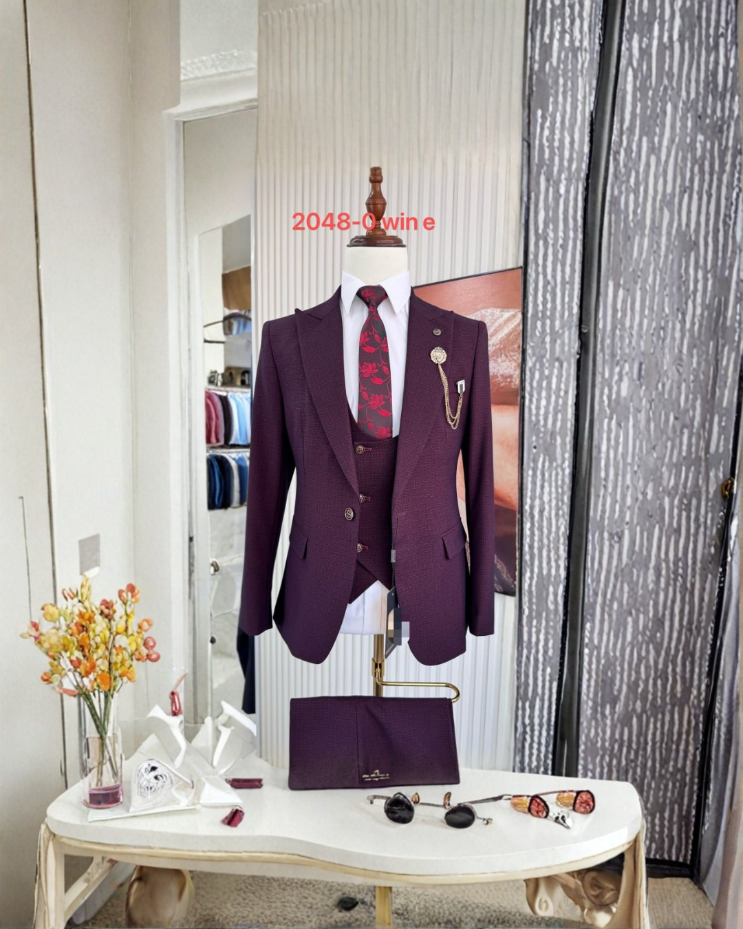 A rich burgundy 3-piece suit for the gentleman who likes to dress with intention. Comes with a fitted blazer, matching waistcoat, and trousers, styled with a floral tie and lapel chain for a luxury finish. Ideal for weddings, high-end meetings, or Sunday best.