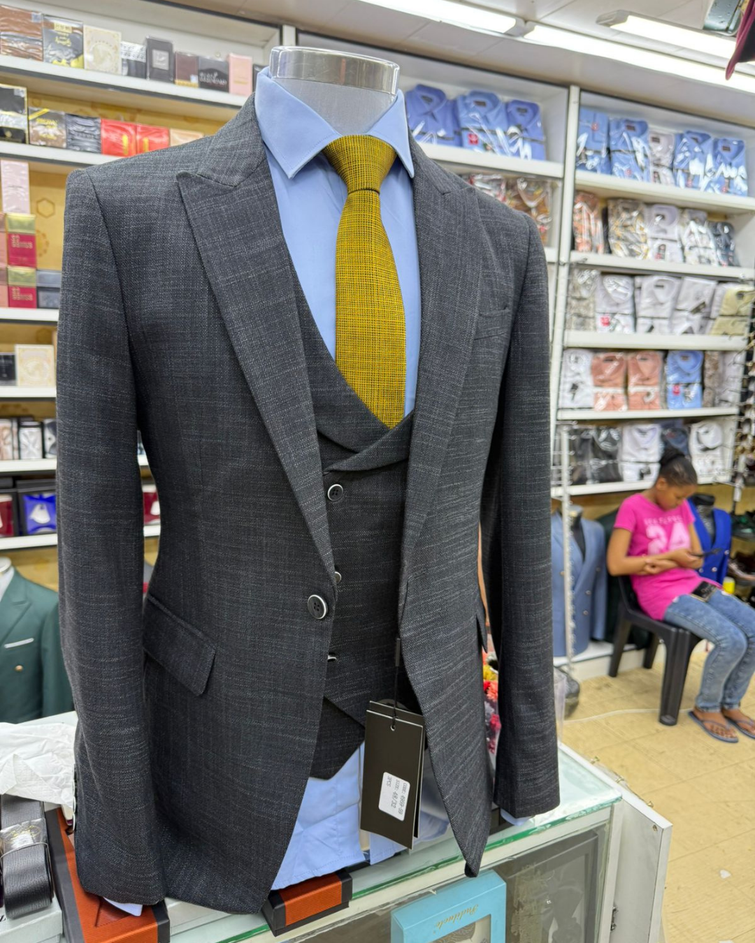 A versatile charcoal 3-piece suit styled with a mustard tie for contrast. The fabric has a light texture, giving it a premium, European look. Ideal for office, presentations, or formal family events.