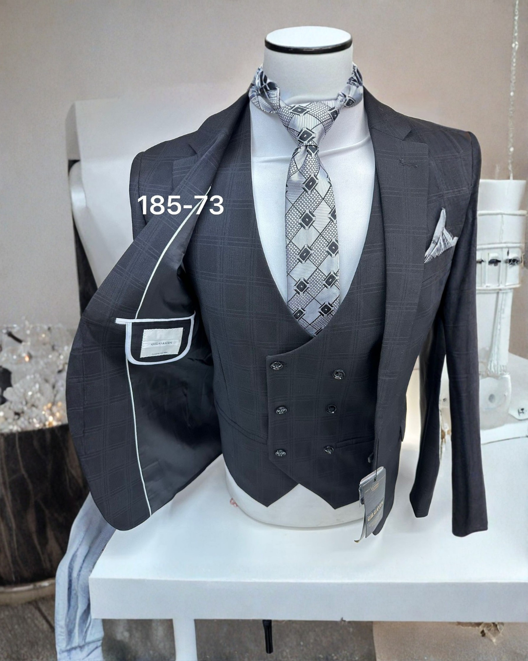 This charcoal suit features a subtle check pattern and a double-breasted waistcoat for a very polished, European look. The matching monochrome tie and pocket square complete the set. Perfect for business functions, weddings, and formal photo shoots.