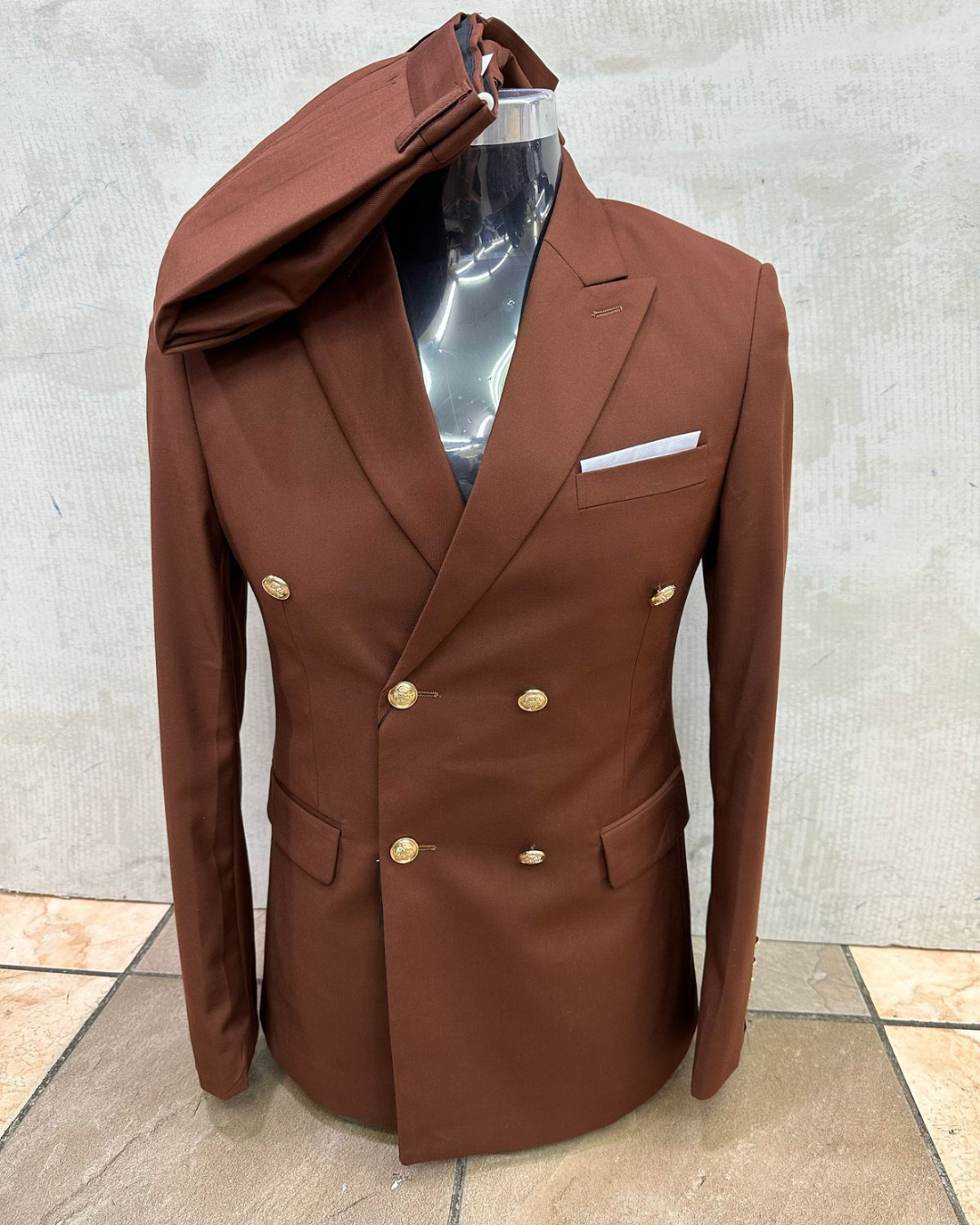 Sharp and powerful. This chestnut/brown double-breasted suit features gold buttons, peak lapels, and a slim silhouette. Great for men who want something different from navy but still formal.