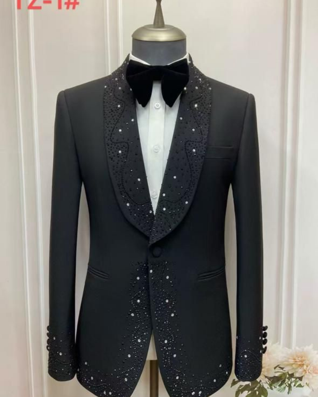 An elegant black tuxedo jacket embellished with stones along the lapel, cuffs, and hem for a sparkling finish. Paired with a white shirt and velvet bow tie look. Perfect for gala nights, performances, or a groom who wants something different.