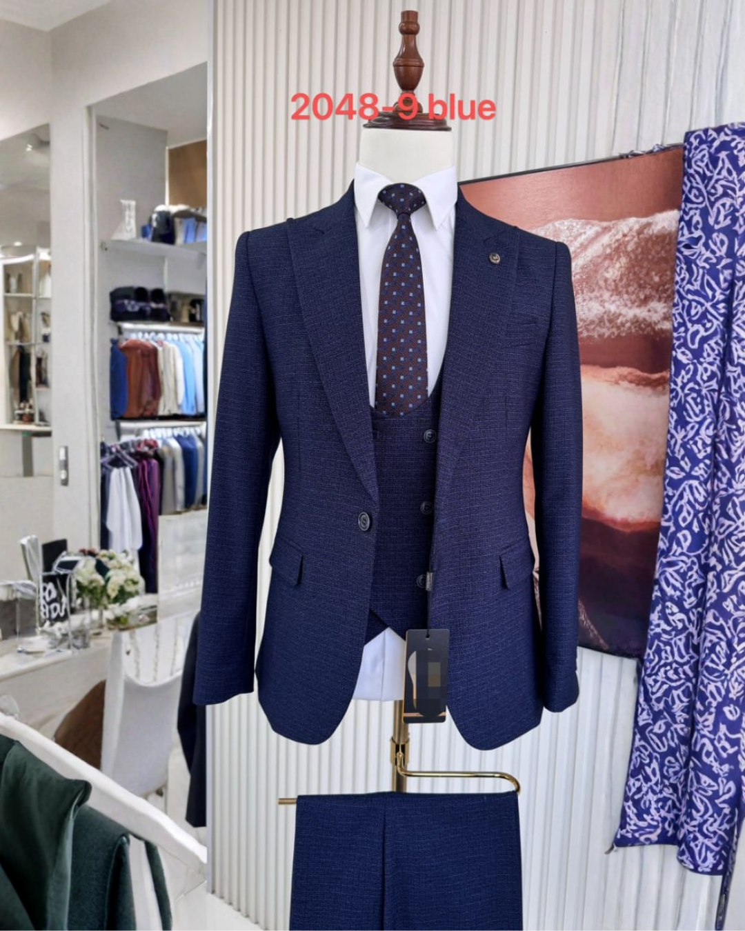A sleek dark-grey 3-piece with a fitted blazer, matching waistcoat, and trousers. Styled with a textured green tie and lapel brooch to give it that boutique look. Ideal for business and events.