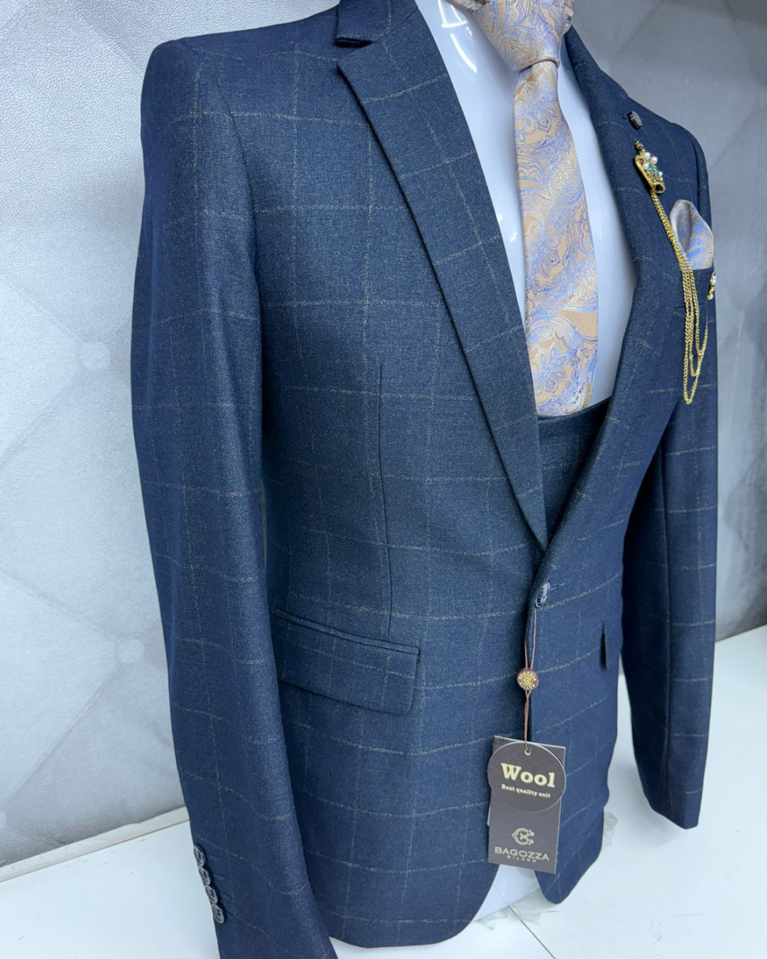 A classic navy suit upgraded with a soft windowpane pattern and premium wool finish. Comes with a matching waistcoat, flap pockets, and is styled with a paisley tie and lapel chain for a luxury touch. Perfect for corporate wear, weddings, and Sunday style.
