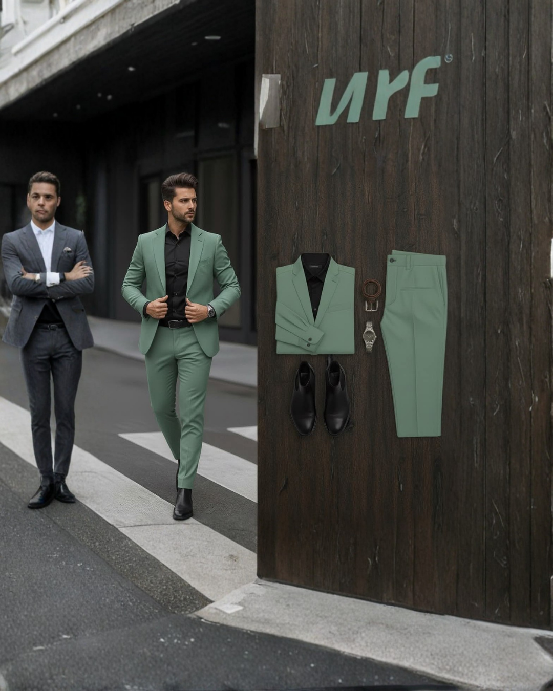 Fresh, modern, and stylish. This sage-green suit is cut slim and styled with a black shirt for contrast — perfect for fashion-forward professionals, Instagram looks, or summer events. Clean lines and minimal detailing keep it sharp.