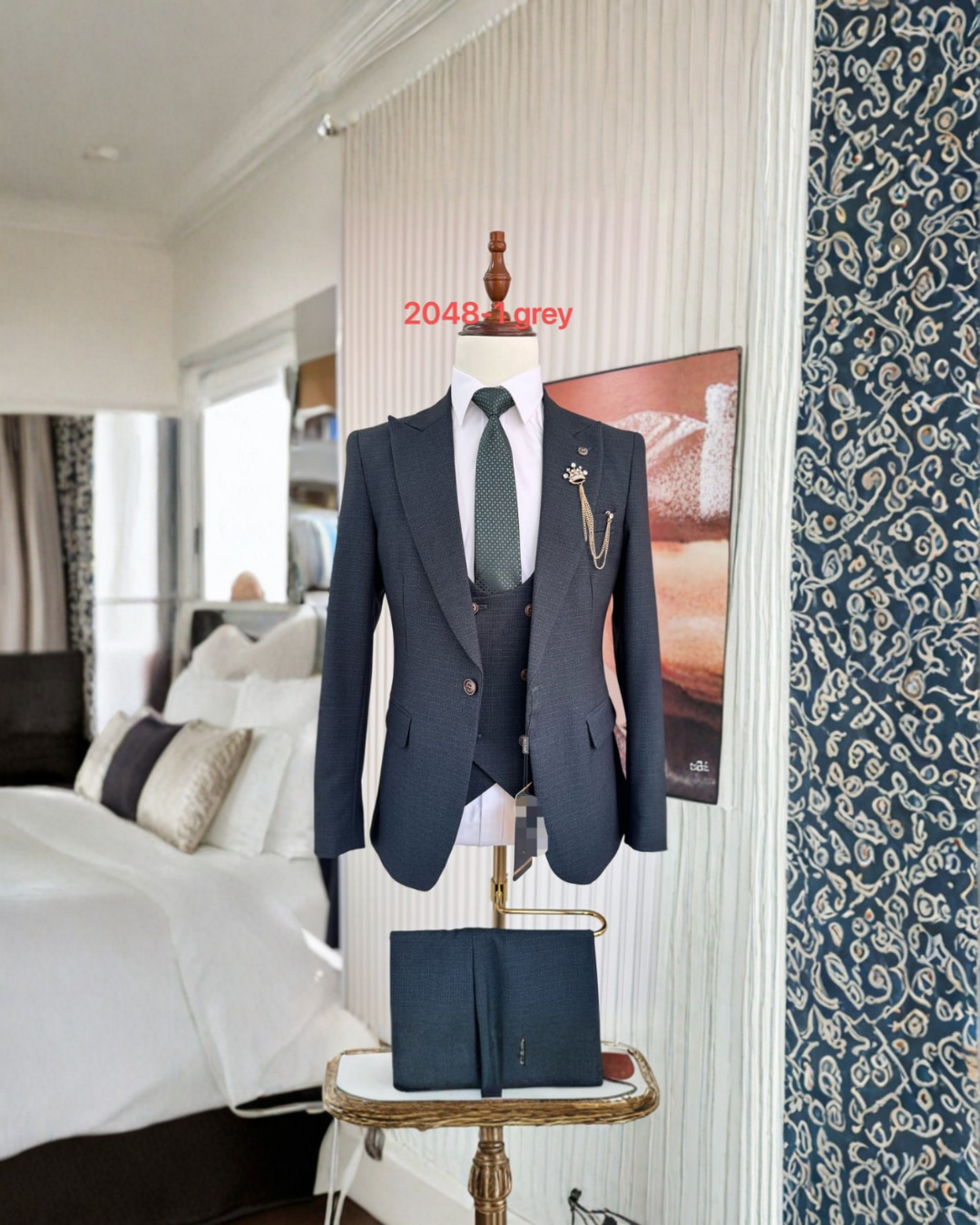 A premium grey 3-piece suit designed for clean, modern dressing. The tailored blazer, matching waistcoat, and trousers are complemented with a textured green tie and lapel brooch for a polished finish. Great for office executives, groomsmen, or formal occasions.