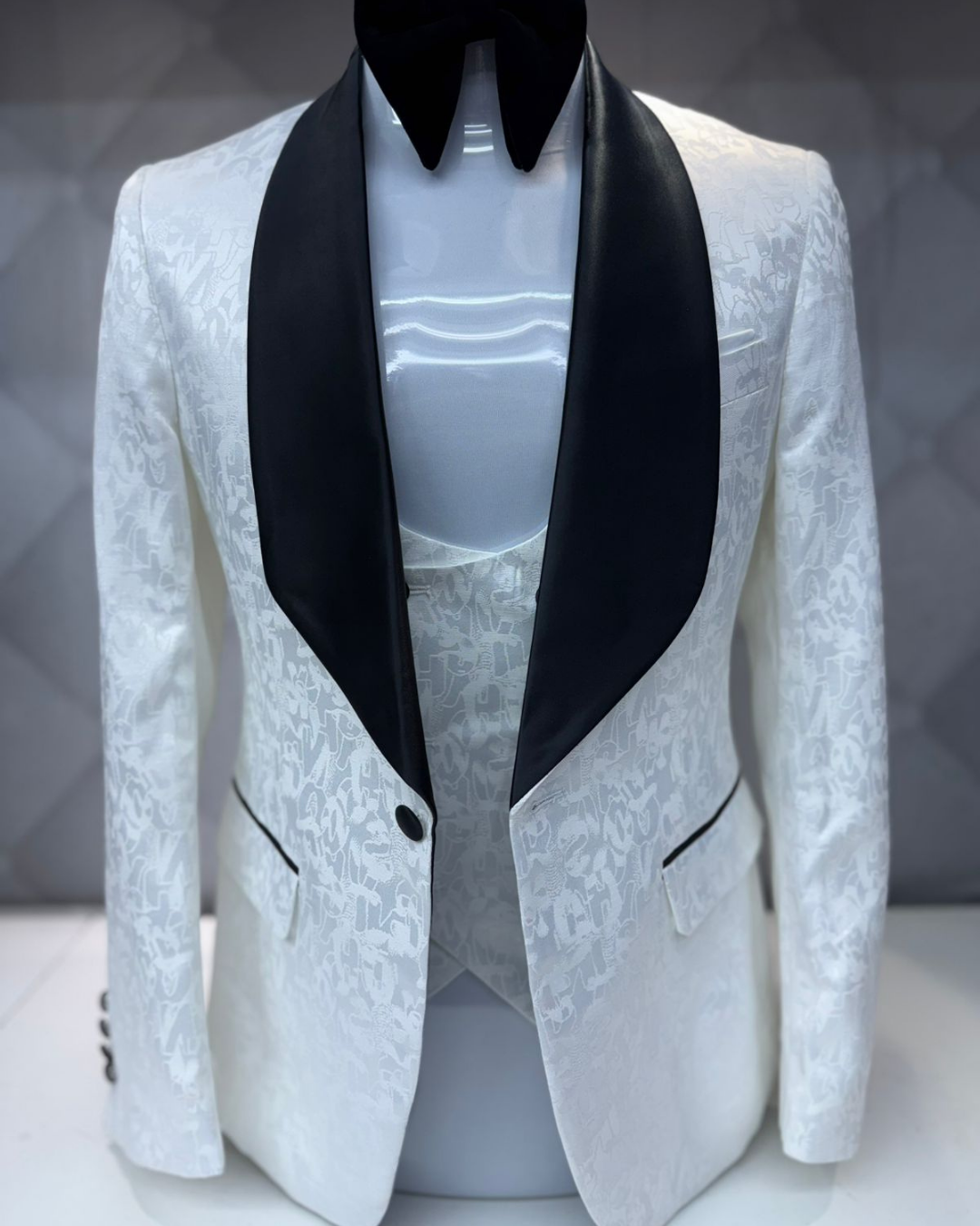 A statement white tuxedo jacket in a textured jacquard fabric, finished with a bold black shawl lapel. Comes with a matching waistcoat for a complete formal look. Ideal for grooms, gala dinners, and premium evening events.